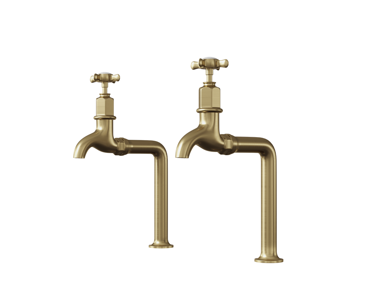 Pair of traditional kitchen bib taps with classic twin crosshead handles. Elegant and traditional twin crosshead handles. Aerated spout mixes air into the water to create a soft, “champagne-like” flow.