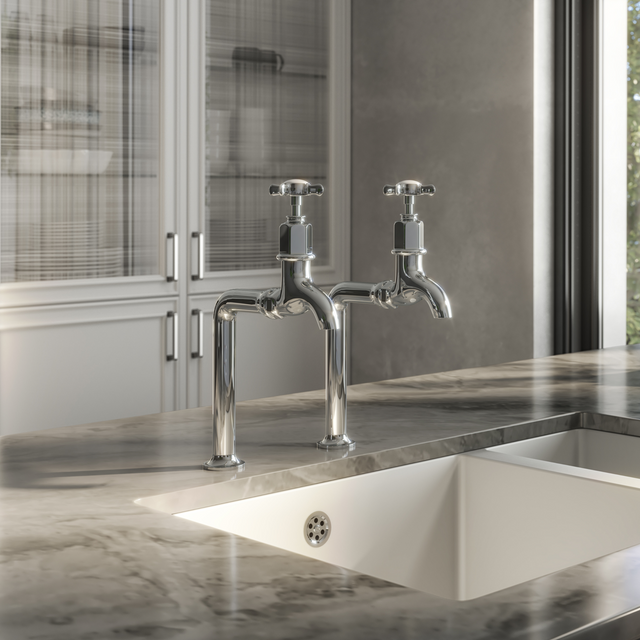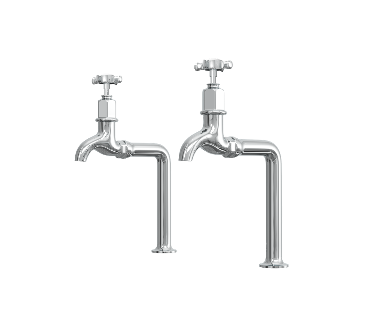 Pair of traditional kitchen bib taps with classic twin crosshead handles. Elegant and traditional twin crosshead handles. Aerated spout mixes air into the water to create a soft, “champagne-like” flow.