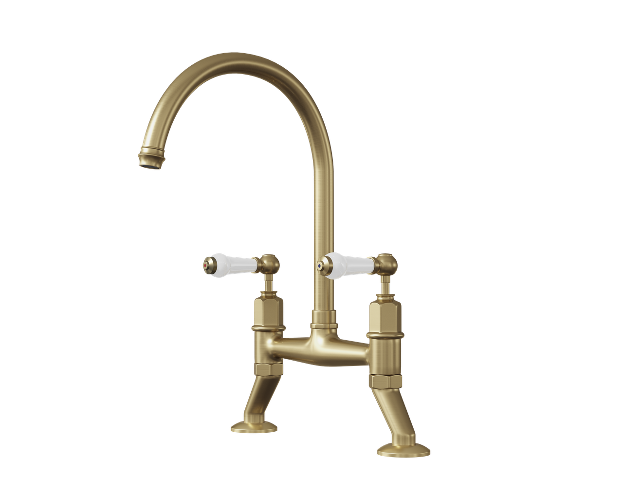 Traditional-design kitchen bridge mixer tap with built-in adjustment for easy retrofitting to an existing sink. Features swan-neck spout which rotates for convenience, and hot and cold tap levers. Suitable for use with 1 or 2 bowl sinks.