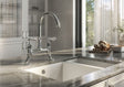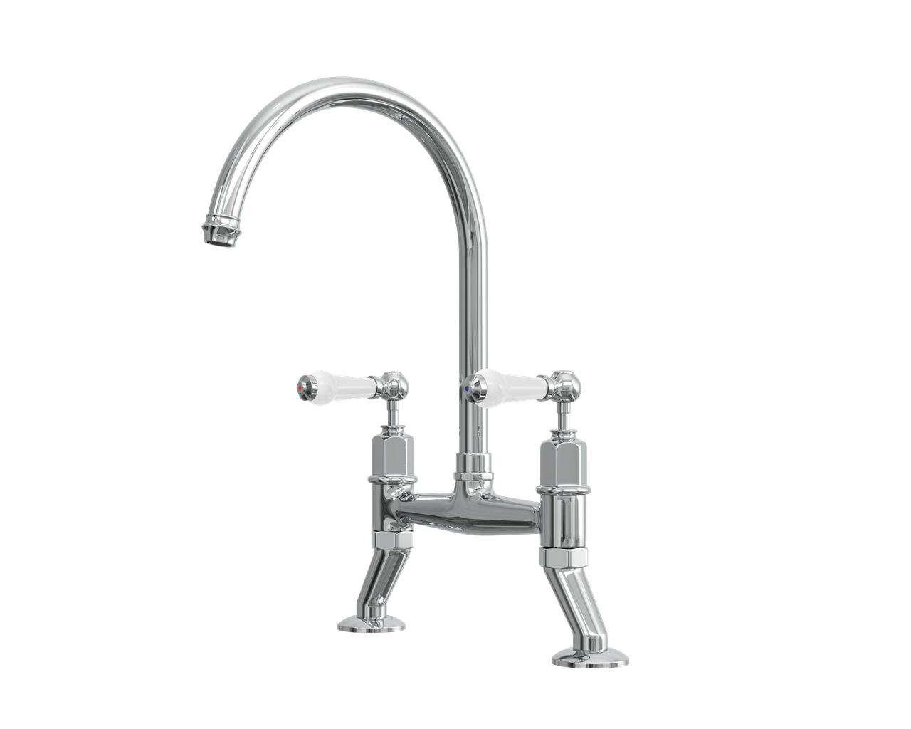 Traditional-design kitchen bridge mixer tap with built-in adjustment for easy retrofitting to an existing sink. Features swan-neck spout which rotates for convenience, and hot and cold tap levers. Suitable for use with 1 or 2 bowl sinks.