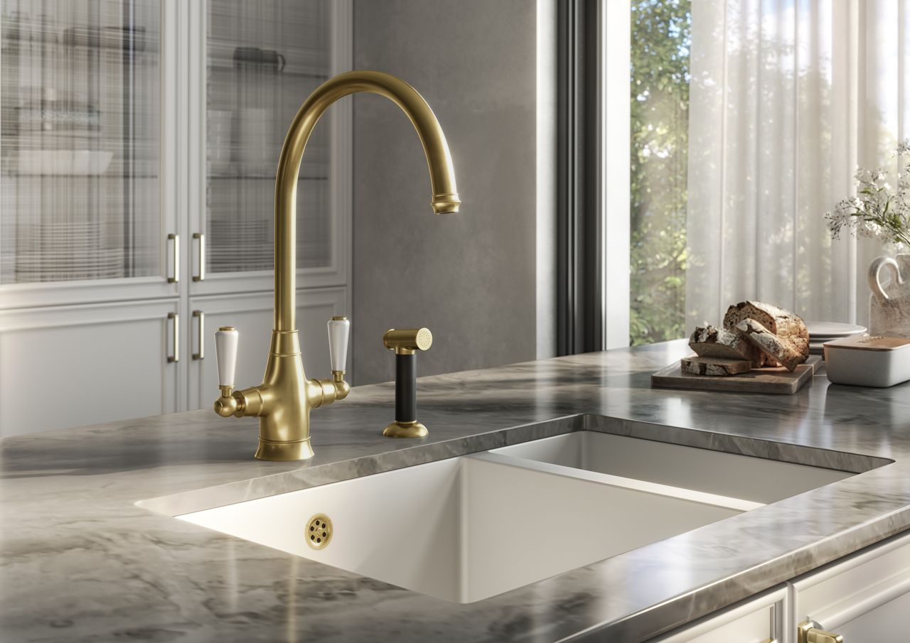 Dual lever kitchen mixer tap with separate rinser. Features convenient swan-neck swivel spout suitable for 1 or 2 bowls, and elegant, ceramic, hot and cold dual levers. Ideal for traditional kitchen settings.