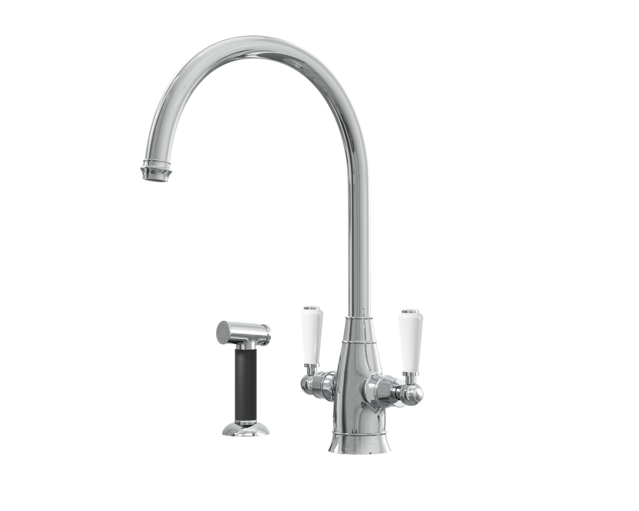 Dual lever kitchen mixer tap with separate rinser. Features convenient swan-neck swivel spout suitable for 1 or 2 bowls, and elegant, ceramic, hot and cold dual levers. Ideal for traditional kitchen settings.